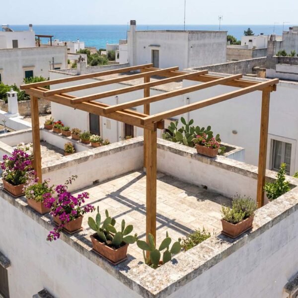 È la base perfetta per creare un angolo relax su misura, un gazebo per pranzi all’aperto o un supporto solido per piante rampicanti e teli ombreggianti.